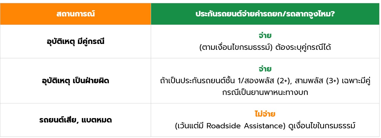 2.ค่ารถยกหรือรถลากอยู่ในความคุ้มครองของกรมธรรม์ โดยเฉพาะประกันรถยนต์ ประเภท 1 หรือประเภท 5 แบบสองพลัส (2+), สามพลัส (3+) (ถ้ามีคู่กรณีเป็น “ยานพาหนะทางบก”)
