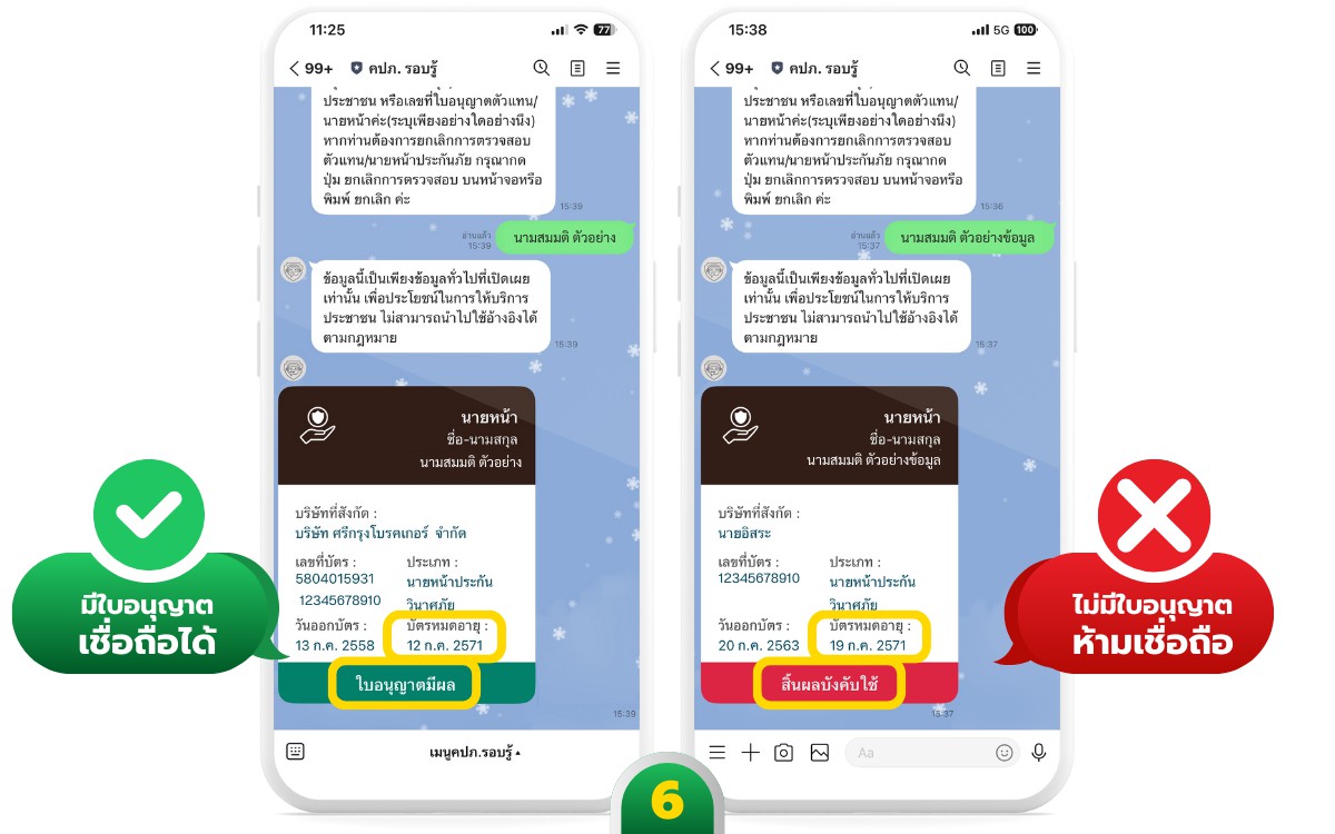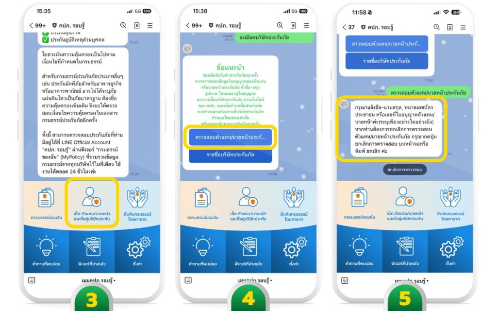ตัวอย่าง เช็กใบอนุญาตคนขายประกันภัยด้วยตนเองผ่าน LINE คปภ.รอบรู้
